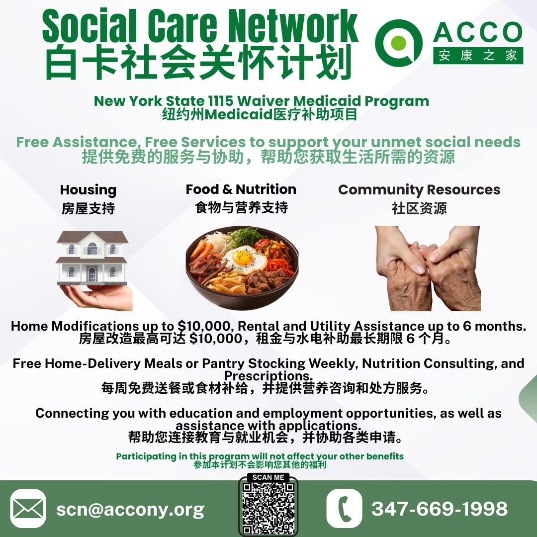 Asian Community Care Organization (ACCO) helps Medicaid members complete screenings and connects them to services such as meal delivery, pantry stocking, nutrition counseling, rental assistance, and home modifications.